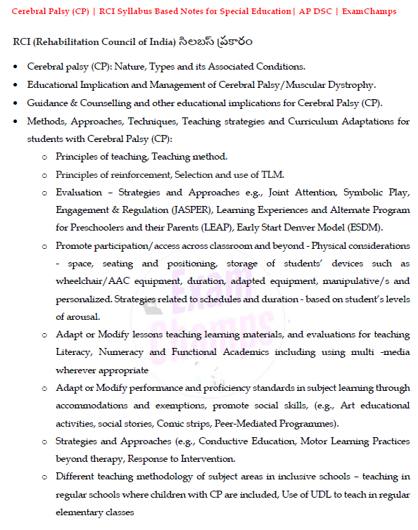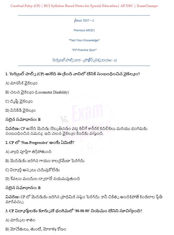RCI (Rehabilitation Council of India) సిలబస్ను అనుసరించి, సెరిబ్రల్ పాల్సీ (CP) అంశంపై పూర్తి అవగాహన కోసం ఈ డిజిటల్ పిడిఎఫ్ (PDF) రూపొందించబడింది. ఇది కేవలం నోట్స్ మాత్రమే కాదు, మీ ప్రిపరేషన్ను పరీక్షించుకోవడానికి 100 ప్రాక్టీస్ బిట్స్ కలిగిన సంపూర్ణ ప్యాకేజీ.