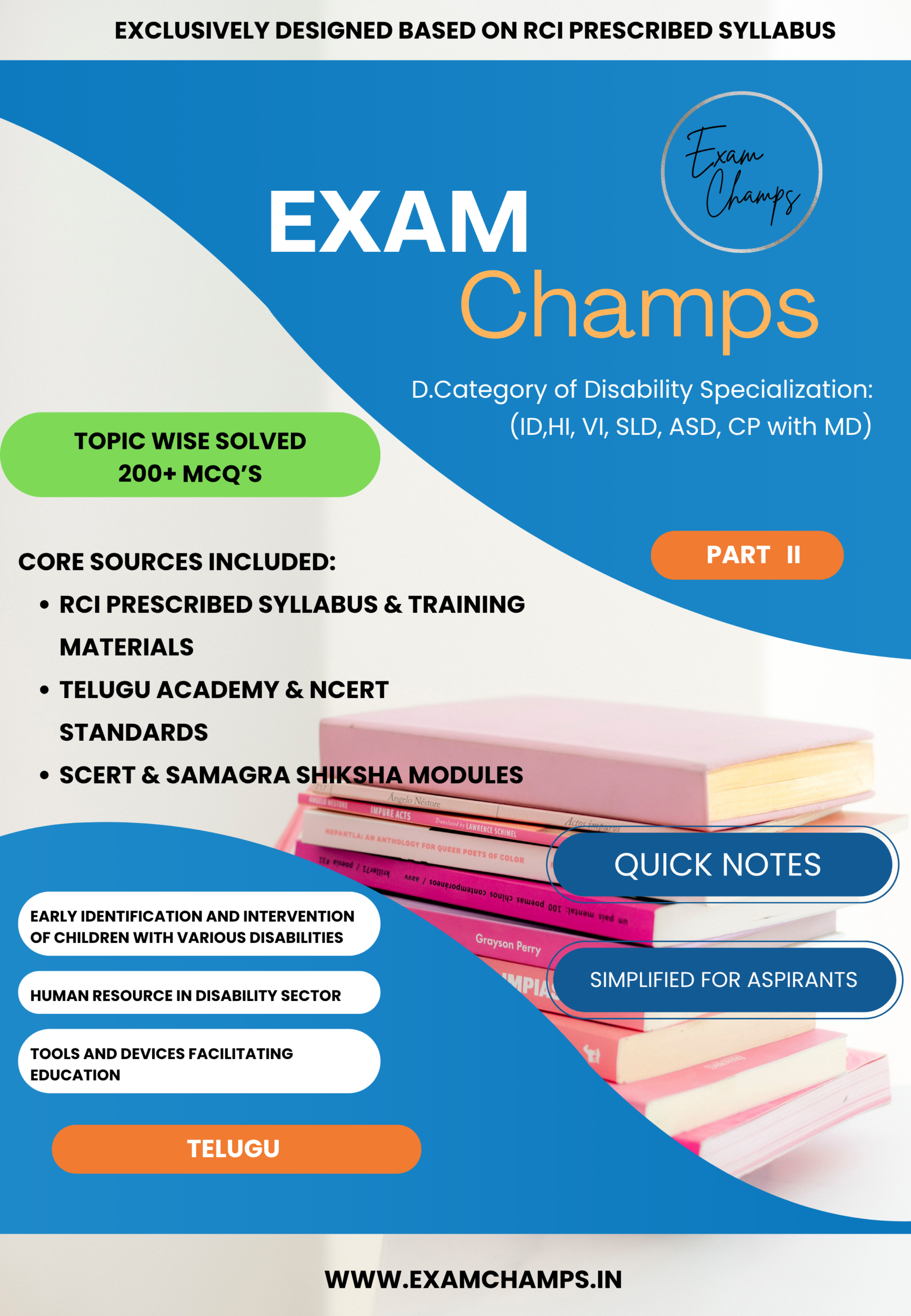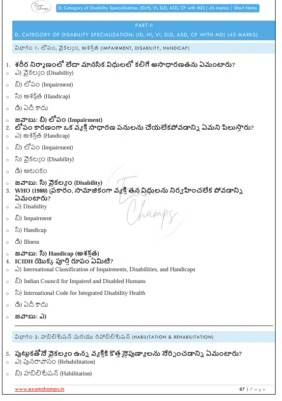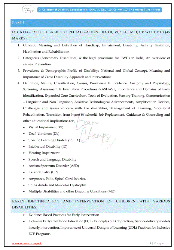- Intellectual Disability (ID), Hearing Impairment (HI), Visual Impairment (VI), Specific Learning Disability (SLD), Autism Spectrum Disorder (ASD), మరియు Cerebral Palsy (CP) with Multiple Disabilities (MD) గురించి వివరణాత్మక నోట్స్.