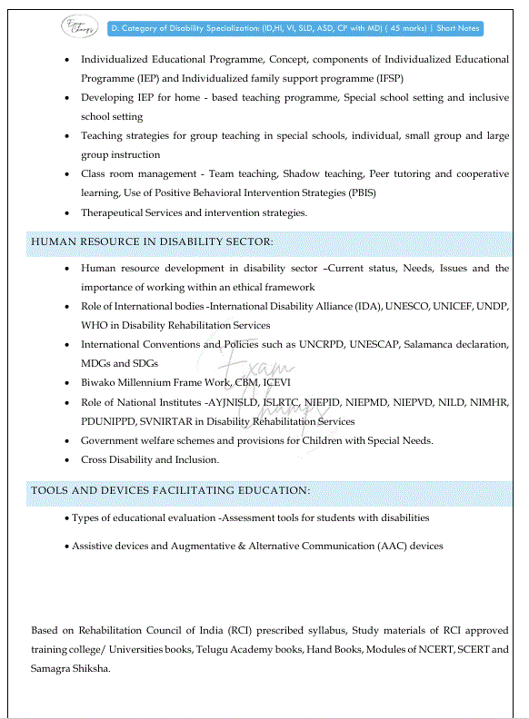 ఈ PDF ప్రత్యేక అవసరాలు గల పిల్లల విద్యాబోధన (Special Education) మరియు పునరావాస రంగంలో రాణించాలనుకునే అభ్యర్థుల కోసం రూపొందించబడింది. ఇందులో RCI Prescribed Syllabus ప్రకారం Category of Disability Specialization కు సంబంధించిన ముఖ్యమైన అంశాలు మరియు 45 మార్కుల సిలబస్ క్షుణ్ణంగా వివరించబడ్డాయి.